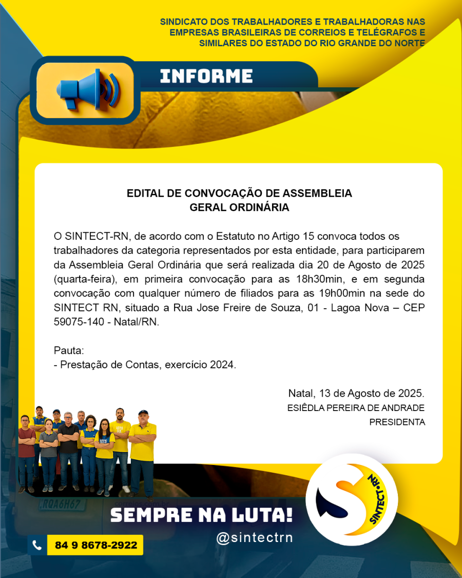 trabalhadores da categoria representados por esta entidade, para participarem da Assembleia Geral Ordinária que será realizada dia 20 de Agosto de 2025 (quarta-feira), em primeira convocação para as 18h30min, e em segunda convocação com qualquer número de filiados para as 19h00min na sede do SINTECT RN, situado a Rua Jose Freire de Souza, 01 - Lagoa Nova – CEP 59075-140 - Natal/RN.