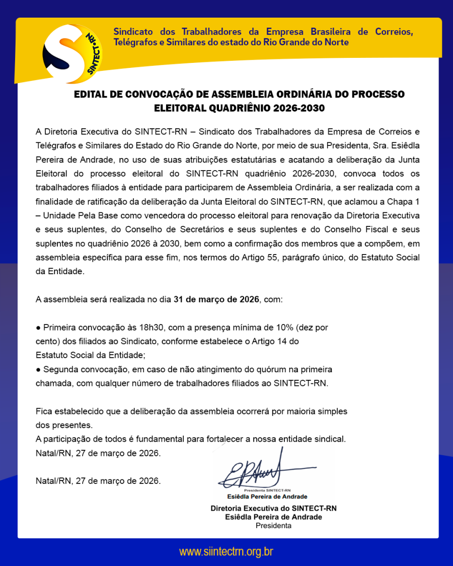 A Diretoria Executiva do SINTECT-RN – Sindicato dos Trabalhadores da Empresa de Correios e Telégrafos e Similares do Estado do Rio Grande do Norte, por meio de sua Presidenta, Sra. Esiêdla Pereira de Andrade, no uso de suas atribuições estatutárias e acatando a deliberação da Junta Eleitoral do processo eleitoral do SINTECT-RN quadriênio 2026-2030, convoca todos os trabalhadores filiados à entidade para participarem de Assembleia Ordinária, a ser realizada com a finalidade de ratificação da deliberação da Junta Eleitoral do SINTECT-RN, que aclamou a Chapa 1 – Unidade Pela Base como vencedora do processo eleitoral para renovação da Diretoria Executiva e seus suplentes, do Conselho de Secretários e seus suplentes e do Conselho Fiscal e seus suplentes no quadriênio 2026 à 2030, bem como a confirmação dos membros que a compõem, em assembleia específica para esse fim, nos termos do Artigo 55, parágrafo único, do Estatuto Social da Entidade.